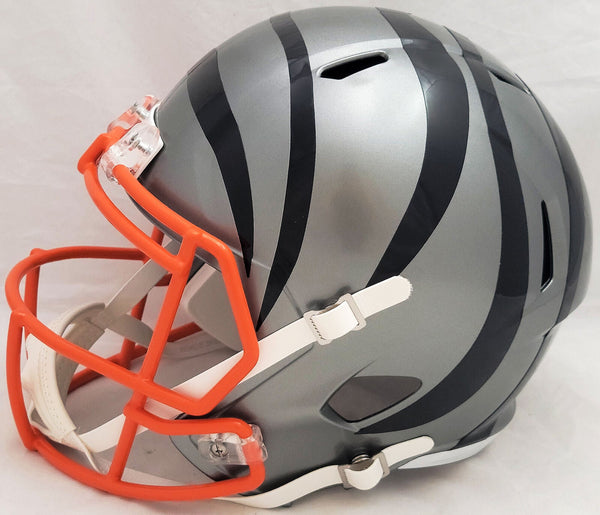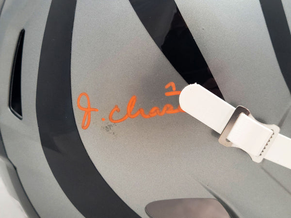 This is a Cincinnati Bengals AMP Gray Full Size Replica Speed Helmet that has been hand signed by Ja'Marr Chase. This item has been certified authentic by Beckett Authentication (BAS) and comes with their tamper-proof QR Code sticker that can be verified on the Beckett-authentication.com.