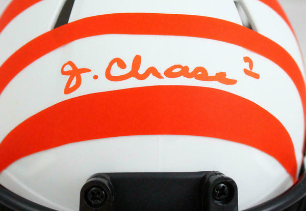 Ja'Marr Chase Autographed Cincinnati Bengals Lunar Speed Mini Helmet *Top -Beckett W Hologram *Orange This is a Ja'Marr Chase of the Cincinnati Bengals hand autographed Riddell Football Lunar Speed Mini Helmet. This item has a Beckett Witnessed Authentication, which comes with a numbered hologram and a QR code for verification. You can view this item on the Beckett Authentication website. It was signed either at a public autograph appearance or a private signing. This is a stock photo of the item. Although you may not receive this exact item, the item you receive is virtually identical, brand new, and in great shape.