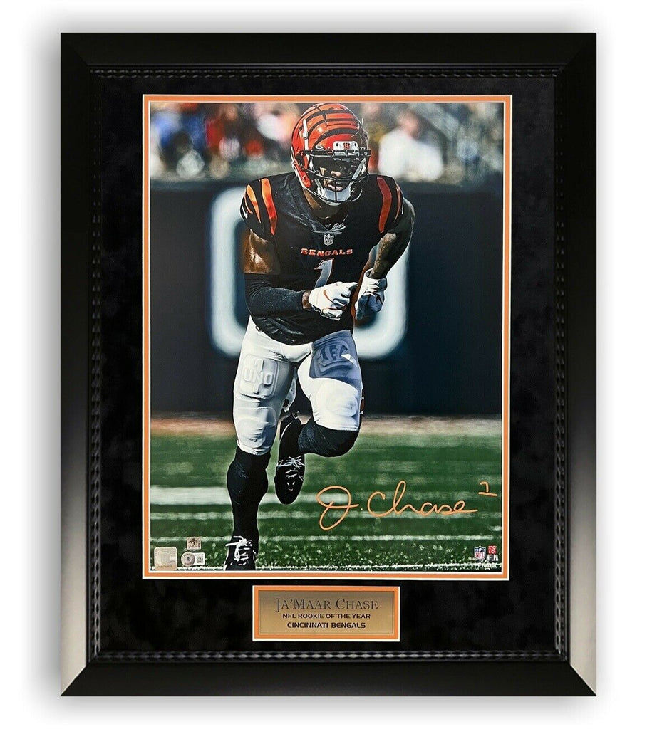 This 16x20 photograph custom framed to 20x24 has been personally hand signed by Ja'Marr Chase of the Cincinnati Bengals 100% authentic Certificate of authenticity by Beckett