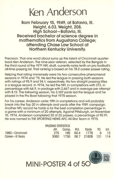 Ken Anderson Autographed Bengals Mini Poster 4/50 NFL MVP BAS 46138