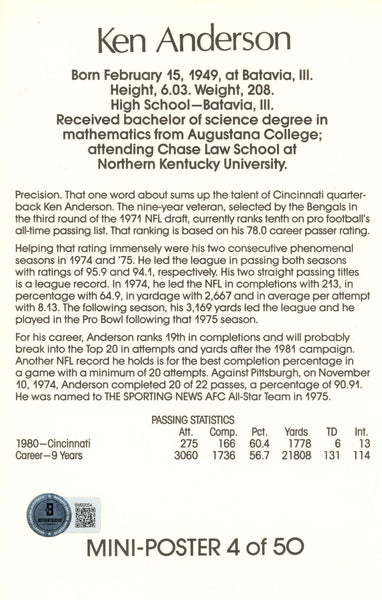 The number in the listing title is just an inventory sku for our records and is not the authentication number. This is a stock photo of the item that you will receive. This is a mini poster measuring 8.5" x 5.5" that was personally autographed by Ken Anderson. Includes a certificate of authenticity from Beckett Authentication Services (BAS) and Denver Autographs.FREE SHIPPING within the USA on orders over $10!