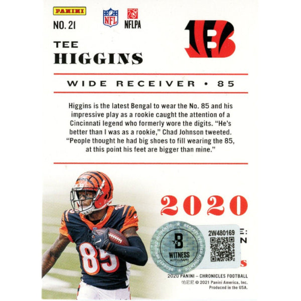 The number in the listing title is just an inventory sku for our records and is not the authentication number. This is the exact item you will receive, please see photos for condition. This is a Cincinnati Bengals Panini Chronicles no. 21 Pink Parallel Trading Card that was personally autographed by Tee Higgins includes "Who Dey" inscription. Includes a certificate of authenticity from Beckett Authentication Services (BAS) and Denver Autographs.FREE SHIPPING within the USA on orders over $10!