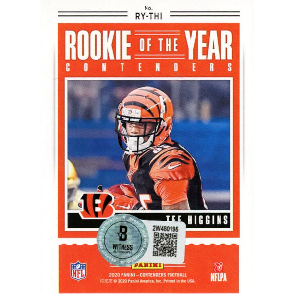 The number in the listing title is just an inventory sku for our records and is not the authentication number. This is the exact item you will receive, please see photos for condition. This is a Cincinnati Bengals Panini Rookie of The Year Contenders no. RY-THI Trading Card that was personally autographed by Tee Higgins includes "Who Dey" inscription. Includes a certificate of authenticity from Beckett Authentication Services (BAS) and Denver Autographs.FREE SHIPPING within the USA on orders over $10!