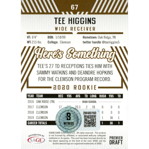 The number in the listing title is just an inventory sku for our records and is not the authentication number. This is the exact item you will receive, please see photos for condition. This is a Cincinnati Bengals Sage Premier Draft no. 67 Trading Card that was personally autographed by Tee Higgins includes "Who Dey" inscription. Includes a certificate of authenticity from Beckett Authentication Services (BAS) and Denver Autographs.FREE SHIPPING within the USA on orders over $10!