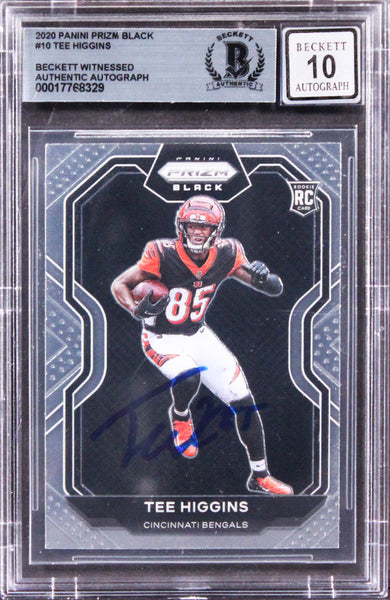 This Autographed Auto Graded Gem Mint 10! 2020 Panini Prizm Black #10 Rookie Card has been Personally Signed by Tee Higgins of the Cincinnati Bengals. This item is 100% Authentic, it comes slabbed and authenticated by Beckett Authentication Services. We have multiples of this same item. While the photographs are representative of this item, the size and placement of the signature may vary. Each item is hand signed, therefore, each autograph is unique.