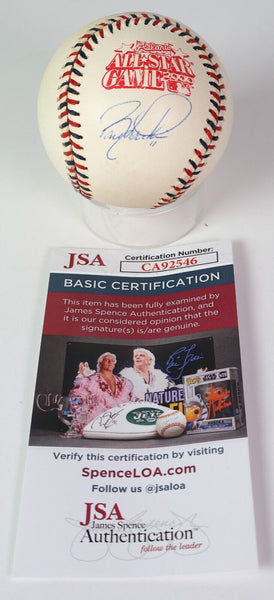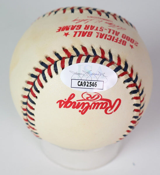 The product is an official 2000 MLB All-Star baseball autographed by Cincinnati Reds player Barry Larkin. The autograph has been authenticated by James Spence Authentication (JSA) ensuring its authenticity. This unique memorabilia item is a must-have for fans of baseball and the Cincinnati Reds, showcasing a piece of history from the 2000 MLB All-Star Game. Perfect for collectors looking to add a special and authentic item to their sports memorabilia collection.