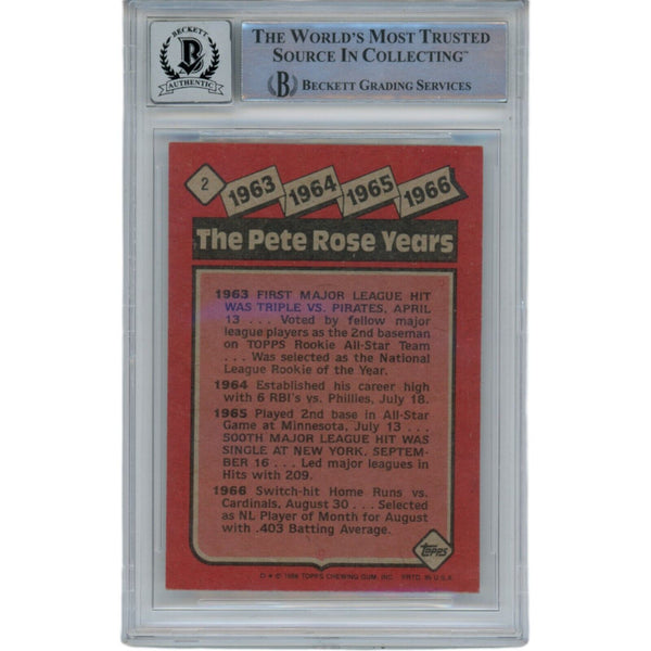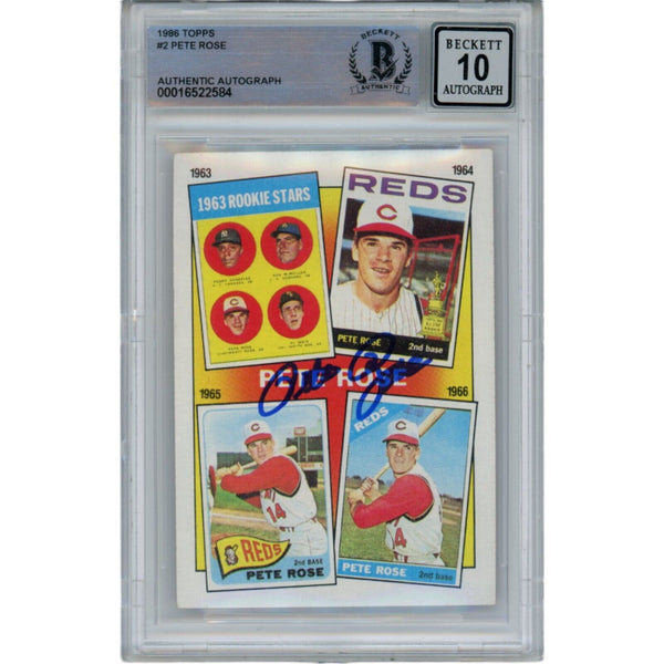 The number in the listing title is just an inventory sku for our records and is not the authentication number. The item pictured is a stock photo unless otherwise noted. This is a Cincinnati Reds 1986 Topps #2 Slabbed Trading Card with a 10 Grade Autograph that was personally autographed by Pete Rose. Includes a certificate of authenticity from Beckett Authentication Services (BAS) and Denver Autographs.FREE SHIPPING within the USA on orders over $10!