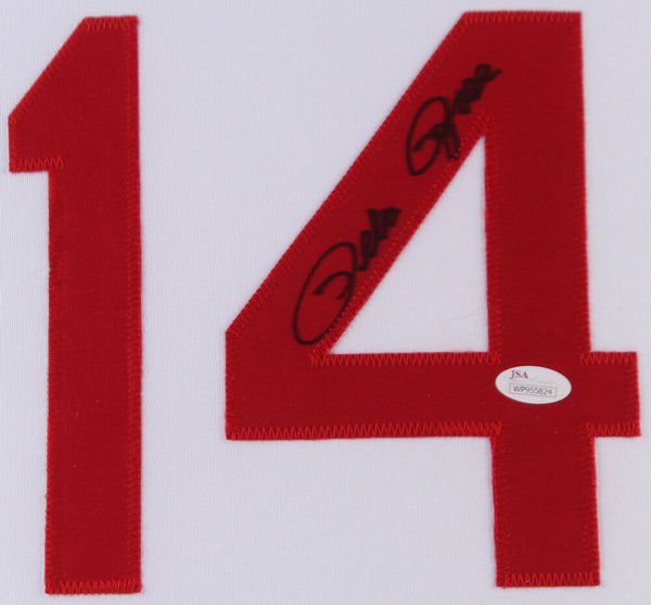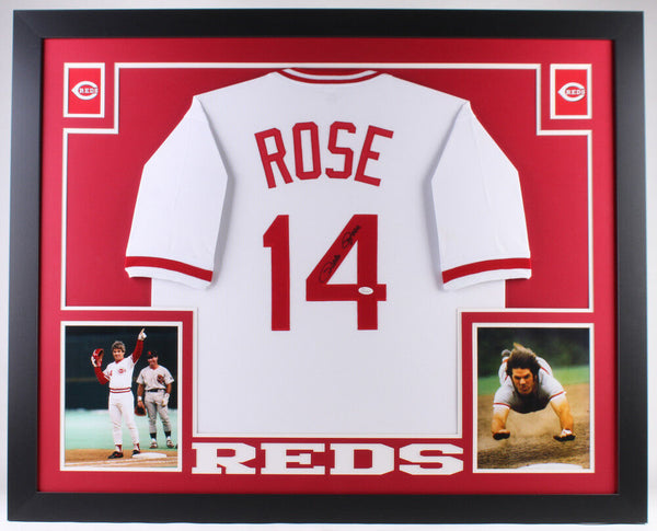 Custom frame measures approximately 35" x 43" in size and features a jersey which has been hand-signed in black felt-tip pen by Pete Rose.Rose is the all-time Major League leader in hits with 4,256. He won three World Series rings, three batting titles, one Most Valuable Player Award, two Gold Gloves, the Rookie of the Year Award, and also made 17 All-Star appearances at an unequaled five different positions (2B, LF, RF, 3B, & 1B). Rose played from 1963 to 1986 for the Cincinnati Reds, Philadelphia Phillies, and Montreal Expos. The lot / autograph(s) includes an official James Spence Authentication (JSA) hologram and matching COA for authenticity purposes. The signing of this item was witnessed by JSA.Authentication: JSA COA