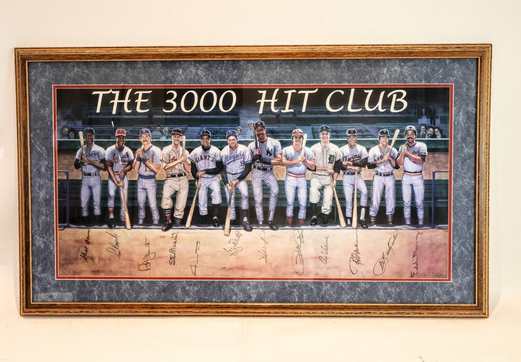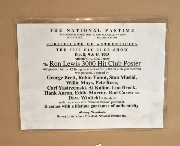 - The Ron Lewis 3000 Hit Club Poster Autographed & Framed- Autographed by George Brett, Robin Yount, Stan Musial, Willie Mays, Pete Rose, Carl Yastrzemski, Al Kaline, Lou Brock, Hank Aaron, Eddie Murray, Rod Carew, and Dave Winfield - The National Pastime Certificate of Authentication