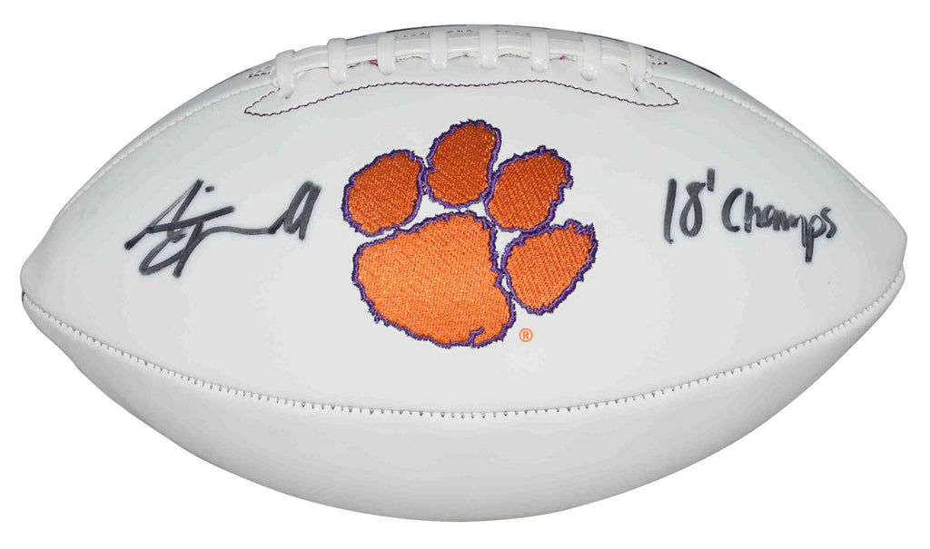 AJ Terrell, former All-American cornerback for the Tigers, has hand signed this Clemson white panel logo football at a private signing. He included the inscription "18 Champs" with his signature. This item comes with a certificate of authenticity (COA) from Beckett Authentication Services and was signed in the presence of one of their representatives. You will receive a serial-numbered COA along with a matching serial-numbered sticker on the ball. The authenticity can be verified online by entering the serial number.Item pictured may not be the exact item you will receive. It will be similar quality, and we guarantee your satisfaction.