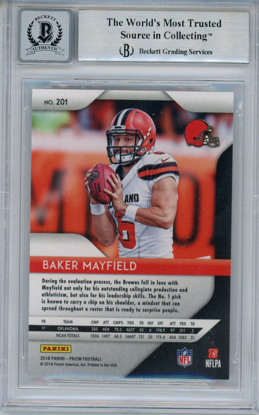 Baker Mayfield Autographed 2018 Panini Prizm #201 Rookie Card BAS 10 Slab 32435 The number in the listing title is just an inventory sku for our records and is not the authentication number. This is a 2018 Panini Prizm #201 rookie trading card that was personally autographed by Baker Mayfield. This has been professionally slabbed by Beckett Authentication Services and includes a certificate of authenticity from Denver Autographs.