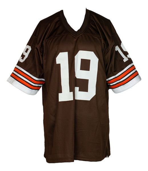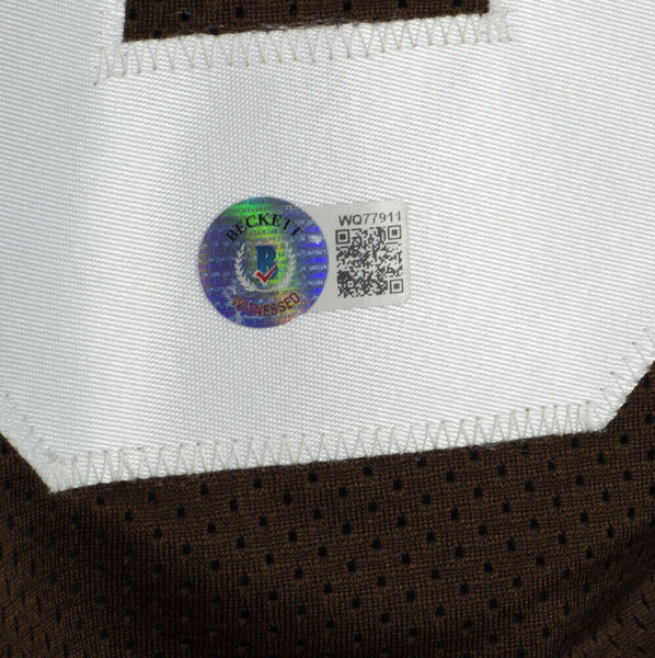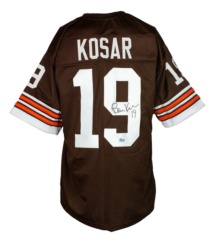 Featured is a Bernie Kosar signed custom brown football jersey. This jersey was hand signed by Bernie Kosar in the presence of a Beckett authentication representative. Included with the jersey is a Beckett hologram and certificate of authentication. This jersey would make a great addition to any sports memorabilia collection. This jersey has hand sewn numbers and letter and has NO logos or any affiliation with any manufacturer or team. It is simply intended as an autographed collectible. SPECIFICATIONS Autographed By: Bernie Kosar Team: Cleveland Browns Sport: Football Authentication: Beckett Grading Services