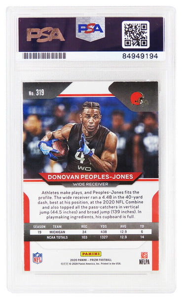 Donovan Peoples-Jones signed Cleveland Browns 2020 Panini Prizm rookie football card #319. The card has been authenticated and encapsulated by PSA/DNA and the number can be verified online. The image of the item is a stock photo, as we may have multiples of the item in stock. The Slabbed Card you will receive will be of the card described. (Same grade, Same authentication) You may or may not receive the exact PSA serial number on the slab label shown in image.
