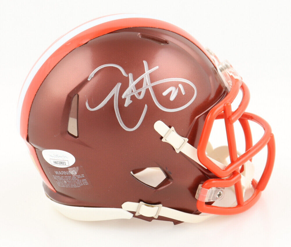 Riddell Cleveland Browns Flash Alternate Speed mini helmet. Hand-signed by Eric Metcalf.The lot / autograph(s) includes an official James Spence Authentication (JSA) hologram and matching COA as well as an official Players Ink Authentication hologram and matching COA for authenticity purposes. The signing of this item was witnessed by JSA.Authentication: JSA COA and PIA COA