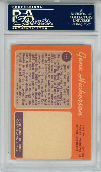 Gene Hickerson Autographed 1970 Topps #233 Trading Card PSA Slab 43637 The number in the listing title is just an inventory sku for our records and is not the authentication number. This is the exact item that you will receive so please see pictures for condition. This is a trading card that was personally autographed by Gene Hickerson. This has been professionally slabbed by Professional Authentication Services (PSA) and includes a certificate of authenticity from Denver Autographs.