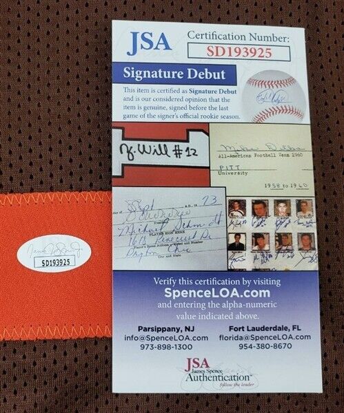 Custom on-field style jersey. Everything is sewn on, size XL. Hand-signed by Greg Newsome II.The autograph(s) includes an official James Spence Authentication (JSA) "Signature Debut" hologram and COA. "Signature Debut" is the autographed memorabilia equivalent to a rookie card. The JSA definition of a "Signature Debut" is as follows: "Any item that is autographed and received by JSA prior to the last game of the signer's official rookie season.Authentication: JSA COA