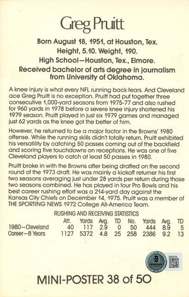 The number in the listing title is just an inventory sku for our records and is not the authentication number. This is the exact item that you will receive so please see pictures for condition. This is a mini poster measuring 8.5" x 5.5" that was personally autographed by Greg Pruitt. Includes a certificate of authenticity from Beckett Authentication Services (BAS) and Denver Autographs.