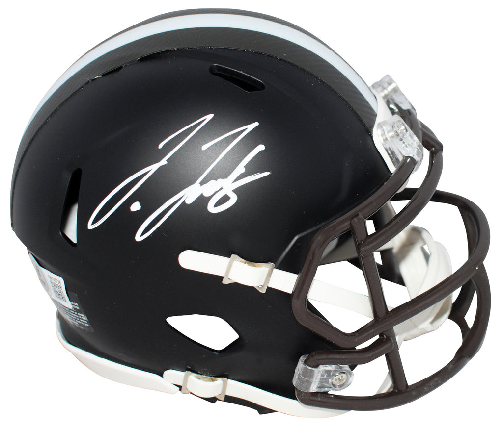Jerry Jeudy, star wide receiver for the Cleveland Browns, has hand signed this Browns Riddell Speed Flat Black mini helmet at a private signing. This item is authenticated by Beckett Authentication Services and was signed in the presence of one of their representatives. Their tamper-evident hologram featuring a QR code and serial number is on the item. The authenticity can be verified online by entering the serial number or scanning the QR code.Item pictured may not be the exact item you will receive. It will be similar quality, and we guarantee your satisfaction.