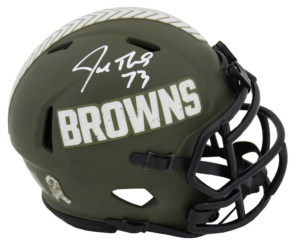 Joe Thomas signed Cleveland Browns Salute to Service Riddell mini helmet. Item comes with a Schwartz Sports Memorabilia tamper-proof numbered hologram and Certificate of Authenticity which can be verified online.