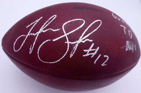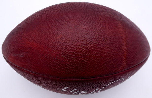 This is an Official Leather NFL Game Used Football that has been Used and hand signed by Josh Gordon. Josh caught a 43 yard Touchdown with this ball on 12-15-13 against the Bears. He inscribed "Game Used TD Ball". This ball was obtained directly from Josh Gordon. It has been certified authentic by Beckett Authentication (BAS) and comes with their sticker and matching certificate of authenticity.