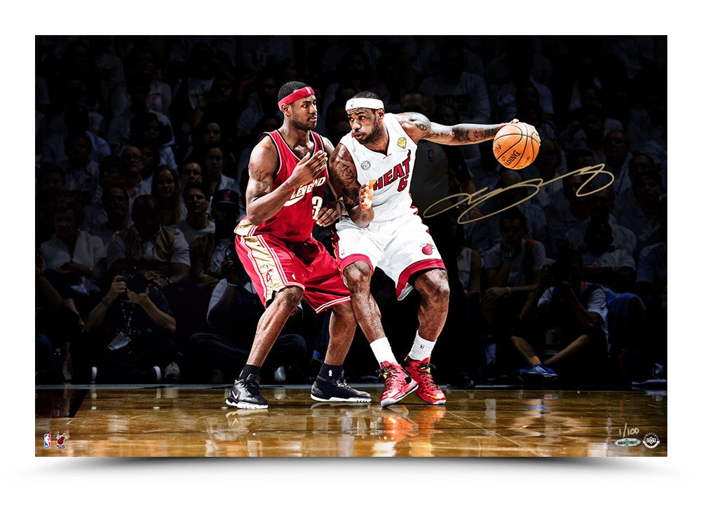 Can you image 18 year old Cleveland Cavaliers rookie LeBron James fresh out of high school playing against Miami Heat LeBron James the ten year veteran with 2 NBA champions and 4 league MVP's? Would the 18 year old try and use his freakish athleticism to score on the older first team All NBA Defensive LeBron? Or would the 10th year LeBron take his exquisite knowledge of the game and all of his off season improvements such as a post game and punish the young rookie? We have created this exact scenario with this limited edition (100) ‘First & Ten' image. James autographed this 16x24 photo in gold paint pen and his signature is authentic via virtue of Upper Deck Authenticated's Five Step Authentication Process.
