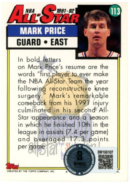 The number in the listing title is just an inventory sku for our records and is not the authentication number. The item pictured is the exact image you will receive, please see photos for condition. This is a Cleveland Cavaliers 1992-1993 Topps #113 Trading Card that was personally autographed by Mark Price. Includes a certificate of authenticity from Beckett Authentication Services (BAS) and Denver Autographs. FREE SHIPPING within the USA on orders over $10!