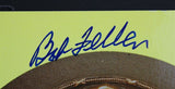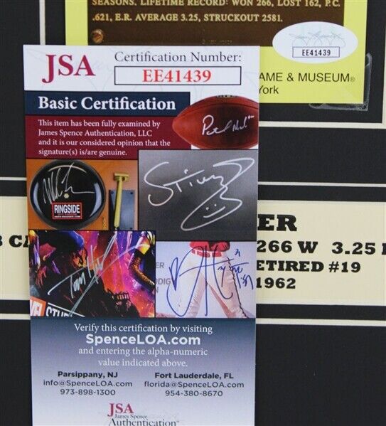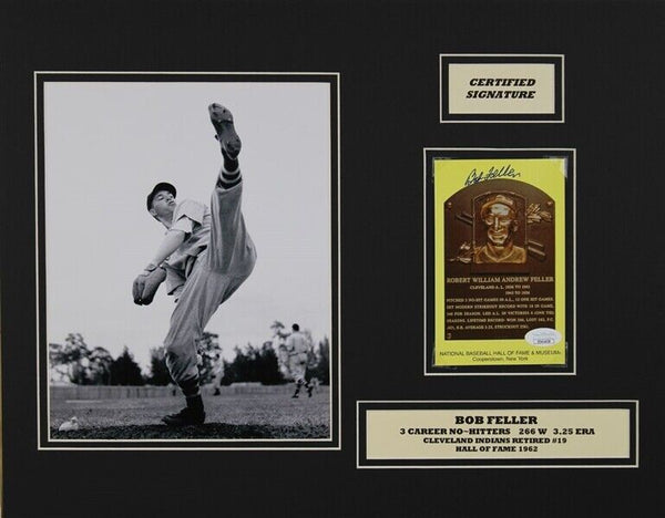 Custom matted display measures 14" x 18" in size. Features a Hall of Fame Plaque Postcard and has been hand-signed in blue felt-tip pen by Bob Feller (D. 2010, Indians). Display also includes an 8" x 10" photo of Bob Feller.In a career spanning 570 games, Feller pitched 3,827 innings and posted a win-loss record of 266-162, with 279 complete games, 44 shutouts, and a 3.25 earned run average (ERA). Feller first played for the Indians at the age of 17. His career was interrupted by four years of military service in World War II. He became the first pitcher to win 24 games in a season before the age of 21. During his career, he threw no-hitters in 1940, 1946, and 1951. Feller also recorded 12 one-hitters. He spent his entire 18 season career with the Cleveland Indians. This autograph is certified by James Spence Authentication (JSA). It comes with the numbered hologram and matching Certificate of Authenticity. Both the card and photo come in a matted display measuring 14" x 18".