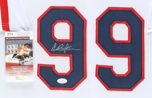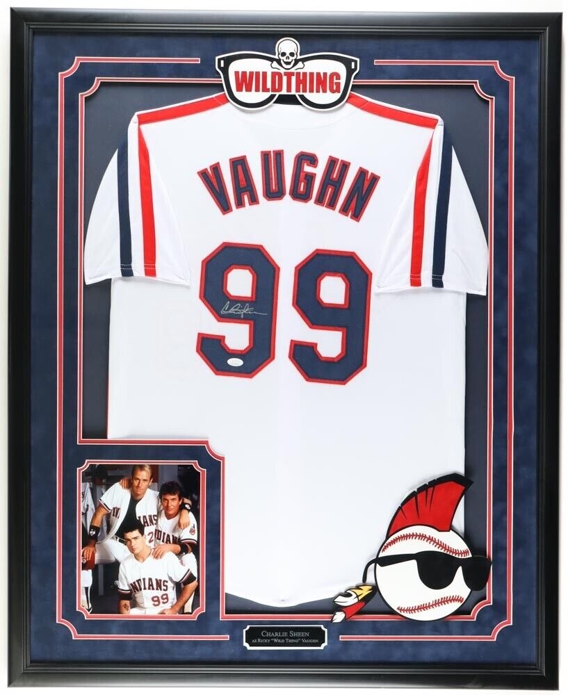 Custom frame measures approximately 35" x 43" in size and features a jersey that has been hand-signed by Charlie Sheen (Ricky "Wild Thing" Vaughn)The autograph includes an official James Spence Authentication (JSA) hologram for authenticity purposes. The signing of this item was witnessed by JSA.Authentication: JSA Hologram
