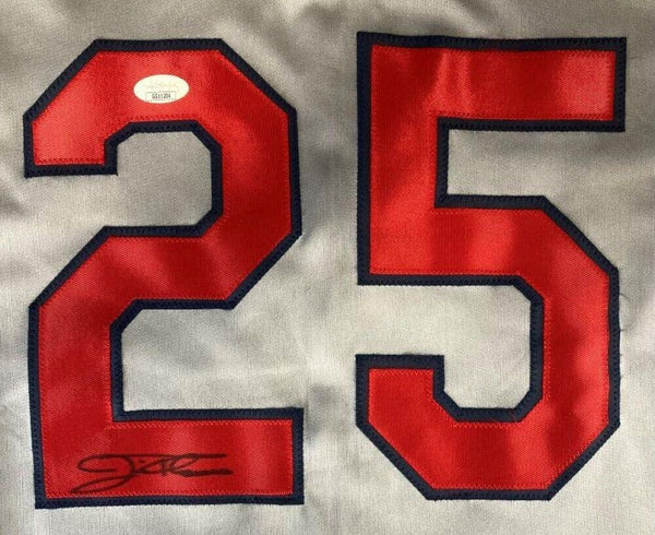 Custom on-field style jersey. Everything sewn on, size XL. Hand-signed in silver paint-pen by Jim Thome. (Cleveland Indians, Philadelphia Phillies, Los Angeles Dodgers, Chicago White Sox, Minnesota Twins, Baltimore Orioles, H.O.F. 2018)The autograph includes an official James Spence Authentication (JSA) hologram and matching COA for authenticity purposes. Authentication: JSA COA