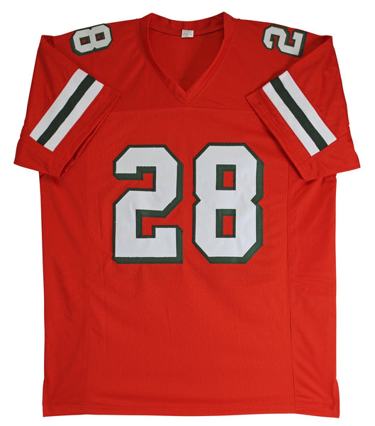 This Autographed Orange Pro Style Jersey has been Personally Signed by Clinton Portis of the Miami Hurricanes. This item is 100% Authentic to include a Certificate of Authenticity (COA) / hologram by JSA Witness. This is a JSA Witnessed Protection Program item which means a JSA representative was present when this item was being signed. This is a stock item. We conducted an autograph signing with Clinton Portis and we have several of these available. The one you will receive will be of equal quality to the one pictured. This item can be verified through JSA Witness. This is a X-Large sized, non-branded, custom-stitched Jersey.