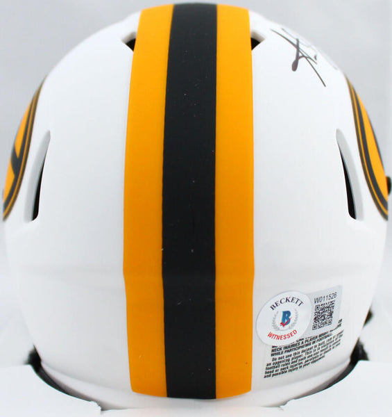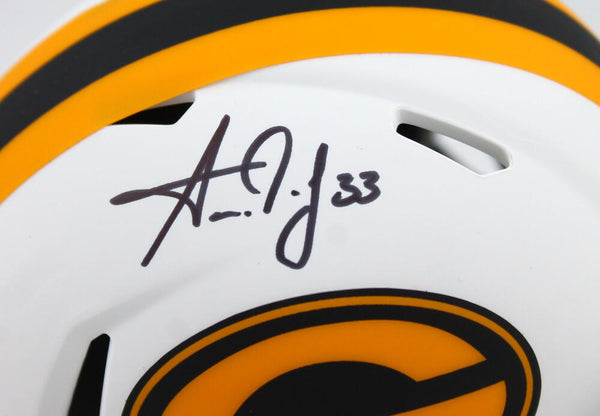Aaron Jones Autographed Green Bay Packers Lunar Speed Mini Helmet- Beckett W Hologram *Black This is a Hand Autographed Helmet of Aaron Jones of the Green Bay Packers. This is a Riddell Football Lunar Speed Mini Helmet. This item has a Beckett Witness Authentication, which Comes with a Beckett #'ed Sticker Hologram and a QR code for verification. You can view this item on the Beckett website and it shows when and where the item was signed. It was signed either at a public autograph appearance or a Private Signing. This is a stock photo of the item. Although you may not receive this exact item, the item you receive is virtually identical and brand new in great shape.
