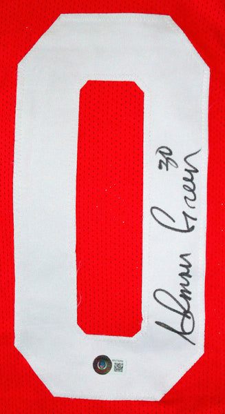 Ahman Green Autographed Red College Style Jersey-Beckett W Hologram *Black THIS IS NOT A NCAA JERSEY. THIS HAS NO TAGS, NO LOGOS, NO EMBLEMS. This is a hand autographed Jersey of Ahman Green. This is Custom Made (non name brand) Authentic Style (stitched letters and numbers). This item has a Beckett Witnessed Authentication, which comes with a numbered hologram and a QR code for verification. You can view this item on the Beckett Authentication website. It was signed either at a public autograph appearance or a private signing. This is a stock photo of the item. Although you may not receive this exact item, the item you receive is virtually identical and brand new in great shape. Jersey size is XL.