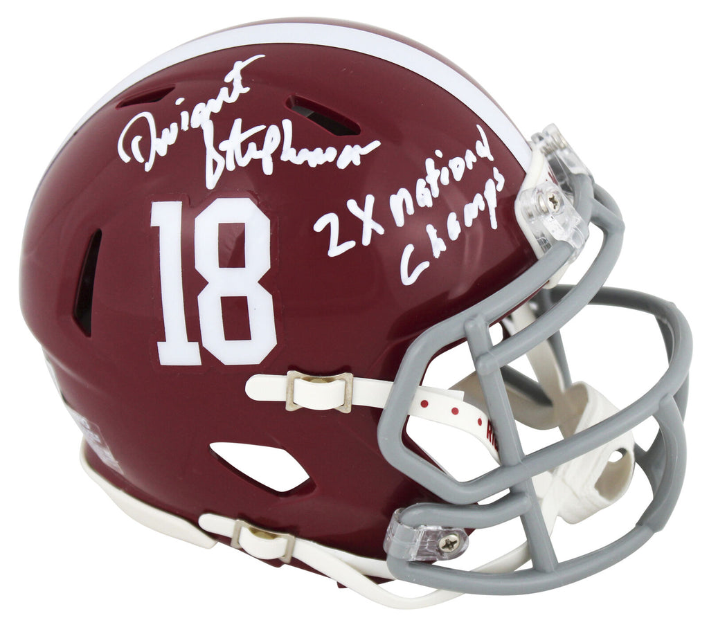 This Autographed Speed Mini Helmet with the inscription of "2x National Champs" has been Personally Signed by Dwight Stephenson of the Alabama Crimson Tide. This item is 100% Authentic to include a hologram by Beckett Authentication Services. This item will come with an affixed Beckett Authentication Services (BAS) authentication sticker, which includes a scannable QR code to verify authenticity. Please note that Beckett no longer provides serial-numbered COA cards, and the attached BAS sticker will serve as the complete authentication for this item. This is a BAS Witnessed Protection Program item which means a Beckett Authentication Service representative was present when this item was being signed. We conducted an autograph signing with Dwight Stephenson where multiples of the same item were signed. While the photographs are representative of this item, the size, placement and strength of the signature may vary. Each item is hand signed, therefore, each autograph is unique. This item can be verified through BAS Witnessed.