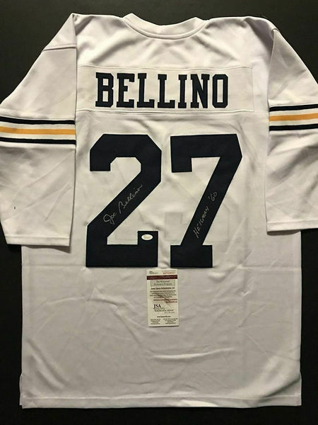 Autographed/Signed JOE BELLINO Heisman 60 Navy Midshipmen White Jersey JSA COA This is a custom jersey and was not manufactured by or in any manner associated with any professional sports league or manufacturer. This custom jersey carries no professional sports league designation. The item is intended to be an autographed collectible. Reference of team in the title is to allow the purchaser a point of association. The custom jersey displays the name, number and authenticated signature of the player. This item in no way is affiliated with or connected to any professional sports organization. The autograph, as always is guaranteed to be authentic and has been certified as authentic by a third-party, trusted authenticator. Size is XL unless otherwise noted.
