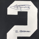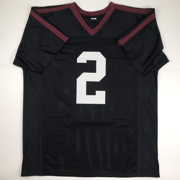 Autographed/Signed Johnny Manziel 12 Heisman Texas A&M Black College Football Je Jersey has no brand names or logos. This is a custom jersey and was not manufactured by or in any manner associated with any professional sports league or manufacturer. This custom jersey carries no professional sports league designation. The item is intended to be an autographed collectible. The custom jersey displays the name and number of the player. This item in no way is affiliated with or connected to any professional sports organization. Size is XL.