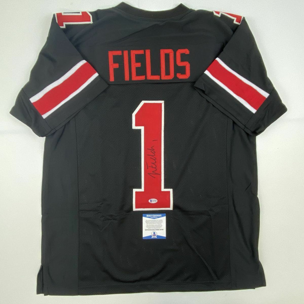 Autographed/Signed JUSTIN FIELDS Ohio State Black College Jersey Beckett BAS COA This is a custom jersey and was not manufactured by or in any manner associated with any professional sports league or manufacturer. This custom jersey carries no professional sports league designation. The item is intended to be an autographed collectible. Reference of team in the title is to allow the purchaser a point of association. The custom jersey displays the name, number and authenticated signature of the player. This item in no way is affiliated with or connected to any professional sports organization. The autograph, as always is guaranteed to be authentic and has been certified as authentic by a third-party, trusted authenticator. Size is XL unless otherwise noted.