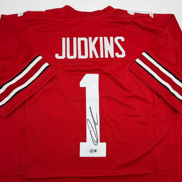 Autographed/Signed Quinshon Judkins Ohio State Red College Jersey Beckett COA Jersey has no brand names or logos. This is a custom jersey and was not manufactured by or in any manner associated with any professional sports league or manufacturer. This custom jersey carries no professional sports league designation. The item is intended to be an autographed collectible. The custom jersey displays the name and number of the player. This item in no way is affiliated with or connected to any professional sports organization. Size is XL.