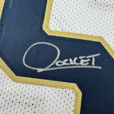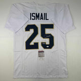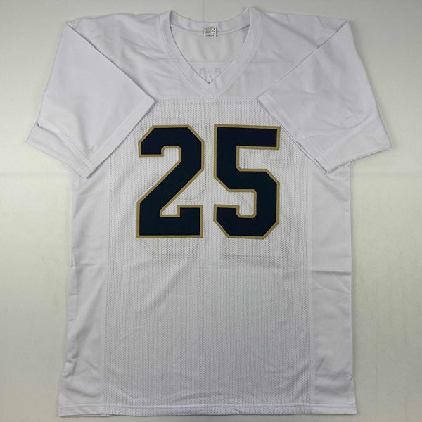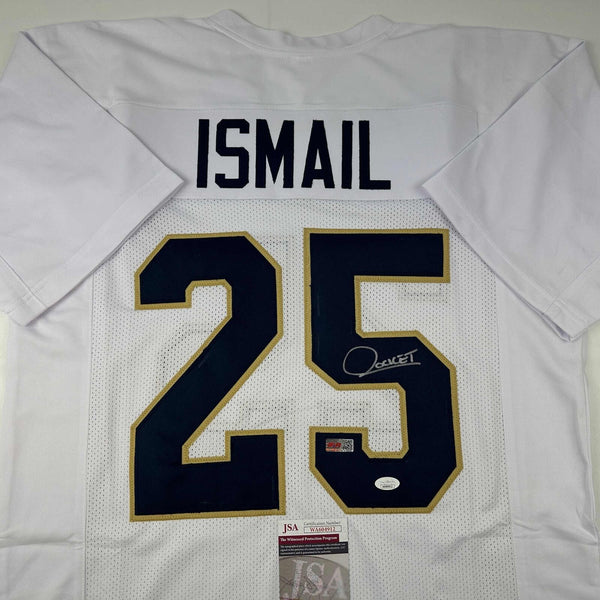 Autographed/Signed Raghib Ismail Rocket Notre Dame White College Jersey JSA COA Jersey has no brand names or logos. This is a custom jersey and was not manufactured by or in any manner associated with any professional sports league or manufacturer. This custom jersey carries no professional sports league designation. The item is intended to be an autographed collectible. The custom jersey displays the name and number of the player. This item in no way is affiliated with or connected to any professional sports organization. Size is XL.