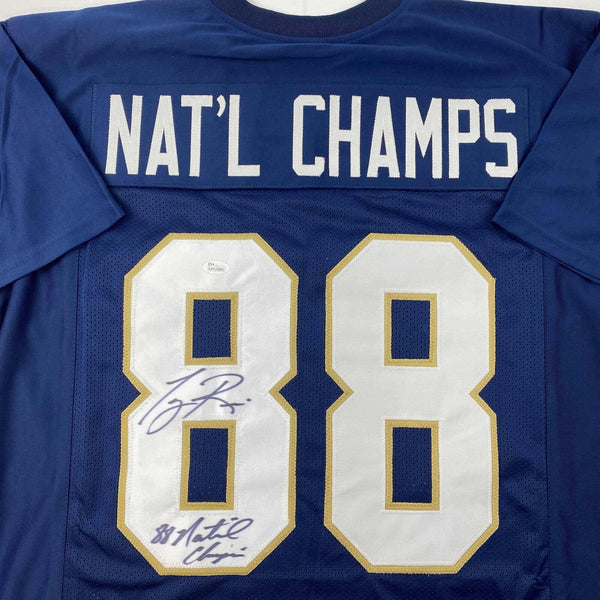 Autographed/Signed Tony Rice 1988 National Champs Notre Dame Blue Jersey JSA COA Jersey has no brand names or logos. This is a custom jersey and was not manufactured by or in any manner associated with any professional sports league or manufacturer. This custom jersey carries no professional sports league designation. The item is intended to be an autographed collectible. The custom jersey displays the name and number of the player. This item in no way is affiliated with or connected to any professional sports organization. Size is XL.