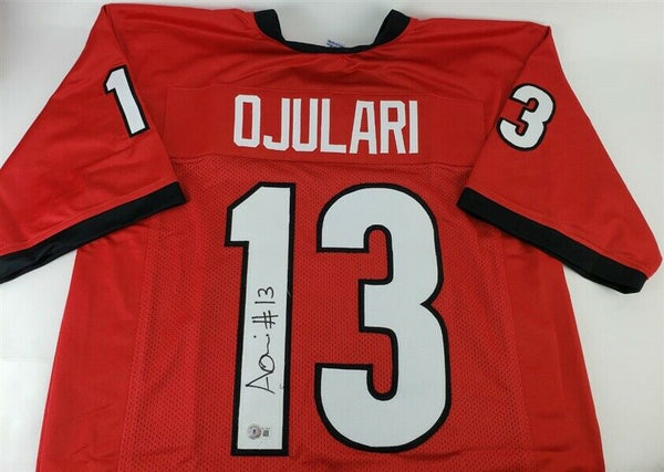 This autographed jersey has been personally hand-signed by Azeez Ojulari of the Georgia Bulldogs. This autograph is certified by Beckett Authentication Services (BAS) Witness Certification. That means that a Beckett representative was present when this item was signed. It comes with the numbered authentication hologram with a QR code that verifies the authentication on the Beckett website.Custom on-field style jerseys are a more affordable option for autograph seekers. These jerseys do not have any brand name or tags and are made in the Philippines. They feature stitched on names and numbers and are made to look very similar to the on-field jerseys that the players wear. These custom jerseys are very commonly used in the memorabilia industry.