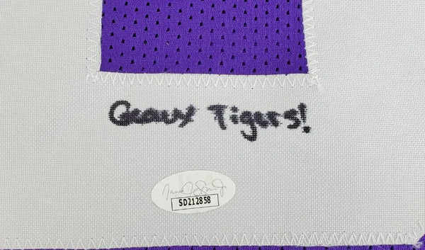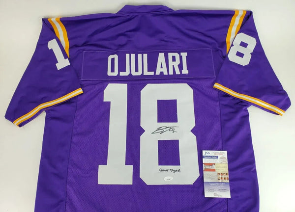 This autographed jersey has been personally hand-signed by BJ Ojulari of the LSU Tigers. When signing, Ojulari inscribed "Geaux Tigers" along with his signature. This autograph is certified by James Spence Authentication (JSA). It comes with the numbered hologram and matching Certificate of Authenticity.Custom on-field style jerseys are a more affordable option for autograph seekers. These jerseys do not have any brand name or tags and are made in the Philippines. They feature stitched on names and numbers and are made to look very similar to the on-field jerseys that the players wear. These custom jerseys are very commonly used in the memorabilia industry.