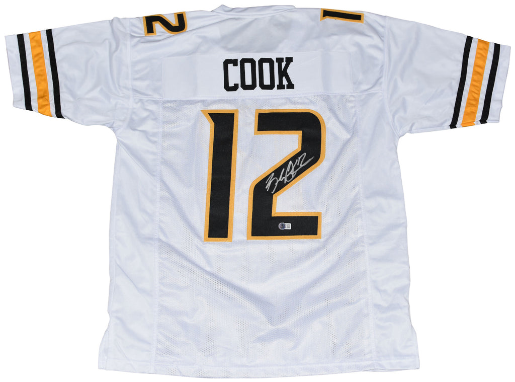 Brady Cook, star quarterback for the Missouri Tigers, has hand signed this white custom jersey at a private signing. Jersey is size XL and all letters/numbers are sewn-on. This item is authenticated by Beckett Authentication Services and was signed in the presence of one of their representatives. Their tamper-evident hologram featuring a QR code and serial number is on the item. The authenticity can be verified online by entering the serial number or scanning the QR code.Item pictured may not be the exact item you will receive. It will be similar quality, and we guarantee your satisfaction.