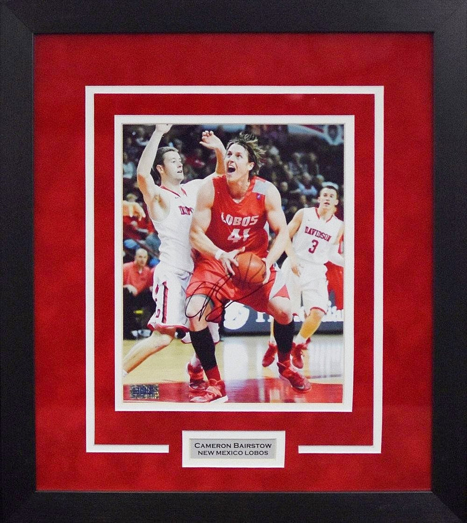 Cameron Bairstow, former star forward for the New Mexico Lobos, has hand signed this 8x10 photo at a private signing. It comes professionally framed in a black wood frame and double matted in New Mexico colors. This item comes with a certificate of authenticity (COA) from Signature Sports Marketing, one of the leaders in the industry. You will receive a paper COA along with matching serial-numbered holograms.Item pictured may not be the exact item you will receive. It will be similar quality, and we guarantee your satisfaction.