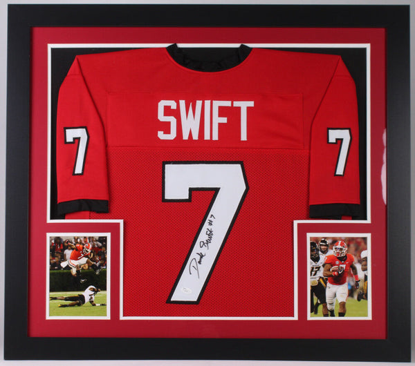 Custom frame measures approximately 31" x 35" in size and features a jersey which has been hand-signed in black felt tip pen by D'Andre Swift. The lot / autograph(s) includes an official James Spence Authentication (JSA) hologram and matching COA for authenticity purposes. Authentication: JSA COA