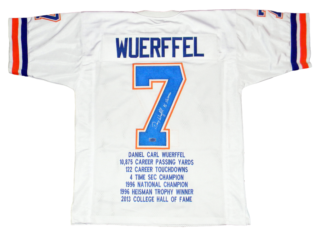 Danny Wuerffel, former Heisman Trophy winning quarterback for the Florida Gators, has hand signed this custom stat jersey at a private signing. He included the inscription "96 Heisman" with his signature. Jersey is size XL and all letters/numbers are sewn-on. This item comes with a certificate of authenticity (COA) from Signature Sports Marketing, one of the leaders in the industry. You will receive a paper COA along with matching serial-numbered holograms.Item pictured may not be the exact item you will receive. It will be similar quality, and we guarantee your satisfaction.