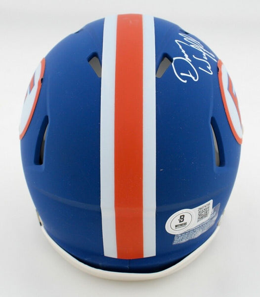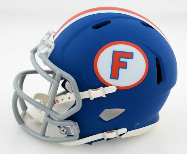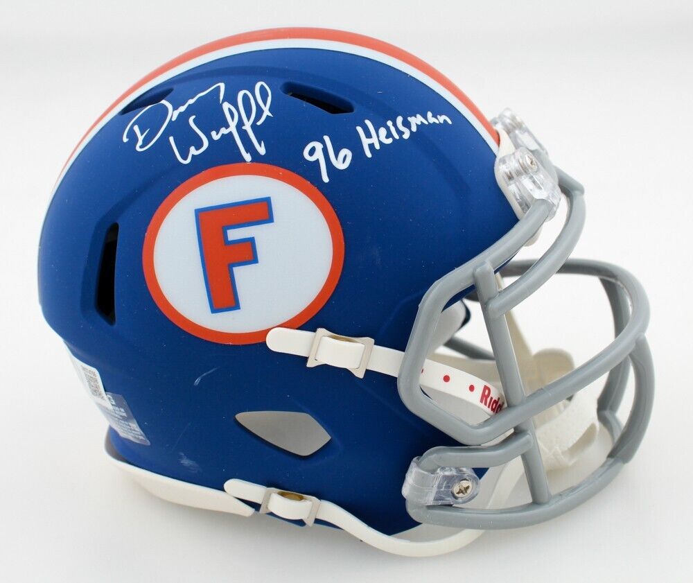 Riddell Florida Gators Speed mini helmet. Hand-signed and inscribed by Danny Wuerffel (HOF).The autograph includes an official Beckett Authentication Services serially numbered hologram and QR Code card for authenticity purposes. The signing of this item was witnessed by Beckett.Authentication: Beckett QR Code card