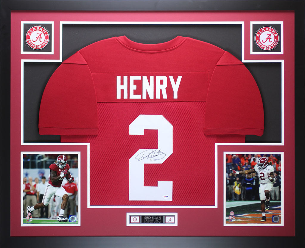 This framed jersey has been personally hand-signed by Derrick Henry. Item is accompanied by a Certificate of Authenticity issued by PSA and a corresponding tamper-proof hologram or sticker on the jersey. To ensure authenticity, the hologram or COA can be reviewed online. This process helps to ensure that the product purchased is authentic and eliminates any possibility of duplication or fraud. It measures 35" x 43" and comes ready to hang in your home or office.