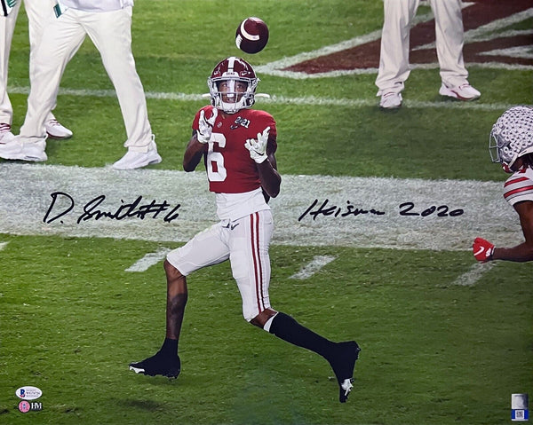 Devonta Smith, former Heisman Trophy winning wide receiver for the Alabama Crimson Tide, has hand signed this 16x20 photo. He included the inscription "Heisman 2020". This item comes with a certificate of authenticity (COA) from Beckett Authentication Services and was signed in the presence of one of their representatives. You will receive a serial-numbered COA along with a matching serial-numbered sticker on the photo. The authenticity can be verified online by entering the serial number.Item pictured may not be the exact item you will receive. It will be similar quality, and we guarantee your satisfaction.