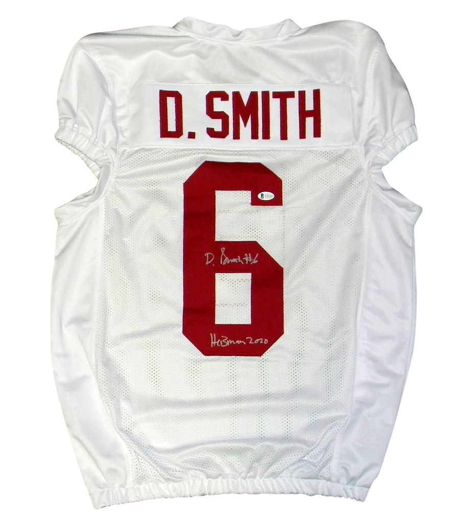 DeVonta Smith, former Heisman Trophy winning wide receiver for the Alabama Crimson Tide, has hand signed this custom jersey at a private signing. He included the inscription "Heisman 2020" with his signature. Jersey is size XL and all letters/numbers are sewn-on. This item comes with a certificate of authenticity (COA) from Beckett Authentication Services and was signed in the presence of one of their representatives. You will receive a serial-numbered COA along with a matching serial-numbered sticker on the jersey. The authenticity can be verified online by entering the serial number.Item pictured may not be the exact item you will receive. It will be similar quality, and we guarantee your satisfaction.