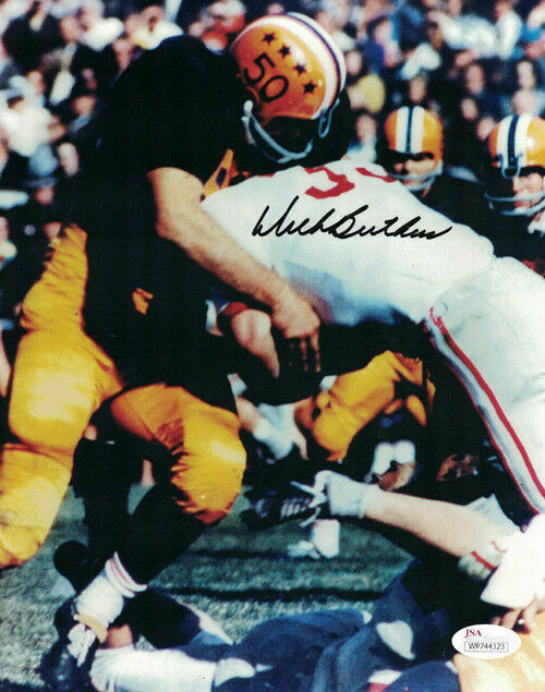DICK BUTKUS AUTOGRAPHED/SIGNED ILLINOIS FIGHTING ILLINI 8X10 PHOTO 21230 JSA This is an 8x10 photo that was personally autographed by Dick Butkus. He was elected into the Hall of Fame in 1979 his first year of eligibility even though he only played 6 seasons, from 1965 until 1970 when he injured his knee and never recovered and officially retired in 1973. During his six seasons he was All-NFL in each season finished second in rookie of the year voting to teammate Gale Sayers and won a championship in '65. This item includes a certificate of authenticity from James Spence Authentication (JSA) and Denver Autographs.